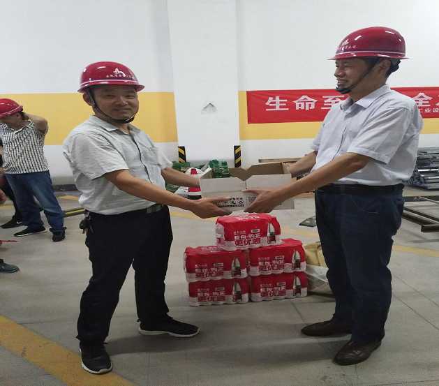 7月23日,第一分公司黨支部書記胡迎東、分管生產(chǎn)副經(jīng)理魯會(huì)、分管安全副經(jīng)理李多德、一分公司工會(huì)副主席鄭佳及相關(guān)部門負(fù)責(zé)人來到省行政中心提升改造項(xiàng)目部,為現(xiàn)場(chǎng)員工發(fā)放了茶葉、礦泉水、花露水等防暑降溫物品,把清涼送到了施工一線,把關(guān)懷送到員工心中!大家紛紛表示:雖然在屋頂露天施工酷熱難耐,但有分公司領(lǐng)導(dǎo)的關(guān)懷,一定能克服高溫環(huán)境帶來的困難,堅(jiān)守崗位,苦干實(shí)干,保質(zhì)保量地按時(shí)完成施工任務(wù)。