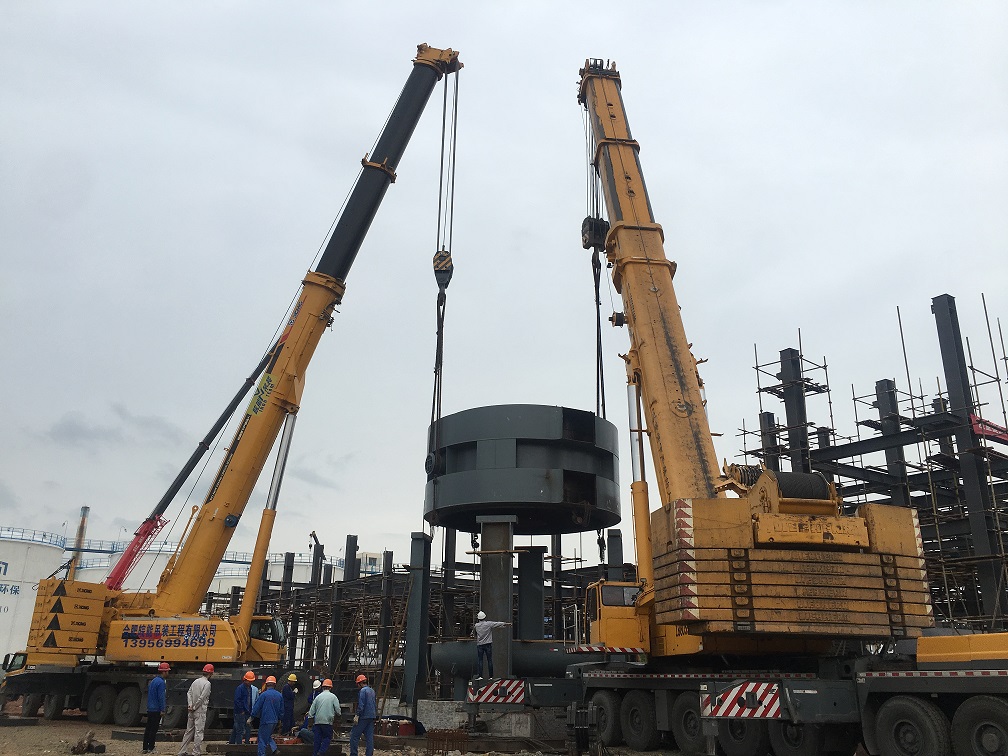 本次吊裝的反應(yīng)器中段部分重達(dá)220噸,分公司領(lǐng)導(dǎo)高度重視,吊裝前期,邀請公司總工吳繼成、總工辦主任牛守義和安全部王岳濤經(jīng)理親臨項(xiàng)目部參與設(shè)備吊裝的專題方案討論定稿工作。當(dāng)日上午,吊裝現(xiàn)場準(zhǔn)備工作緊張卻又有條不紊的進(jìn)行,項(xiàng)目經(jīng)理李子鳳向全體“參戰(zhàn)”員工進(jìn)行了安全交底,工作人員對兩臺分別為500T、350T吊車的站位及性能再次確認(rèn),現(xiàn)場機(jī)具、人員均按既定方案實(shí)施。分公司經(jīng)理史崇松、業(yè)主單位負(fù)責(zé)人、監(jiān)理全程在現(xiàn)場“督戰(zhàn)”,全體工作人員經(jīng)過四個小時的奮戰(zhàn),吊裝作業(yè)圓滿結(jié)束。