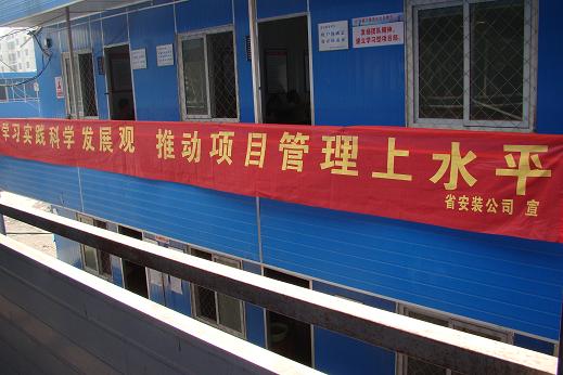 省政務服務中心及綜合樓和合肥中心醫(yī)院項目屬省、市重點工程之一。由多家大中型施工企業(yè)共同承建。我公司承擔的安裝工作量分別在1582萬和2800萬以上,是具有相當規(guī)模和社會影響的工程項目。合肥項目黨支部在開展第二批實踐科學發(fā)展觀活動中,因地制宜地開展宣傳活動。分別在這兩個項目施工現(xiàn)場懸掛了《深入開展學習實踐科學發(fā)展觀活動》和《學習實踐科學發(fā)展觀推動項目管理上水平》的橫幅標語。目前是整個施工現(xiàn)場開展學習實踐科學發(fā)展觀活動中唯一在現(xiàn)場宣傳的一家施工企業(yè)。